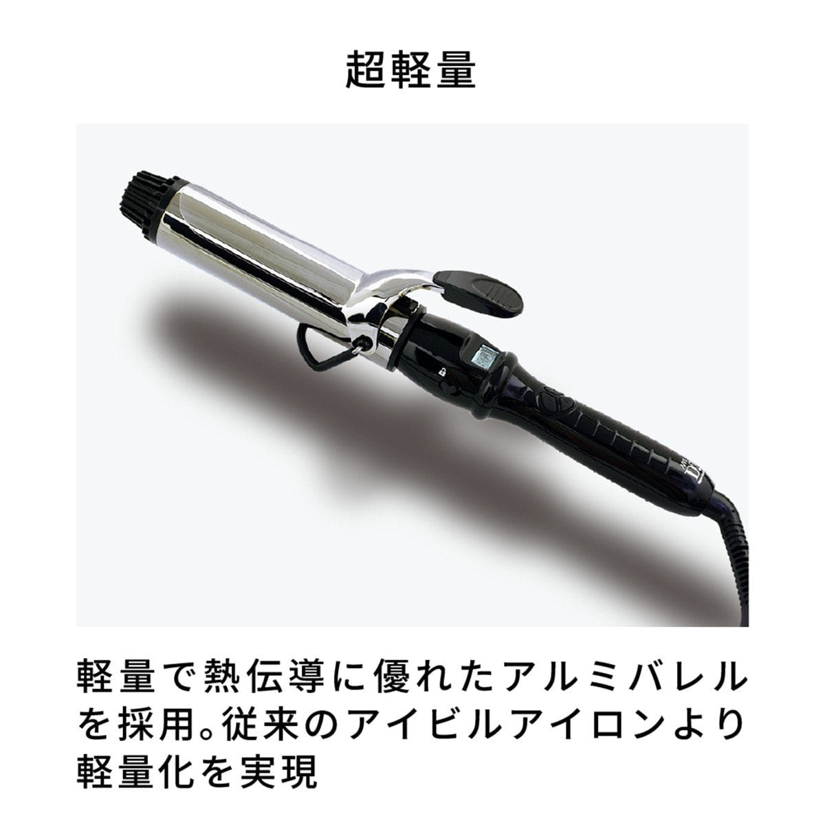 軽くて熱伝導に優れたアルミにチタン/ゴールドにコーティングされた長い髪でも逃げないロングバレル(105㎜)を採用することで、鉄製のバレルに比べ、約30%の軽量化を図りました。
